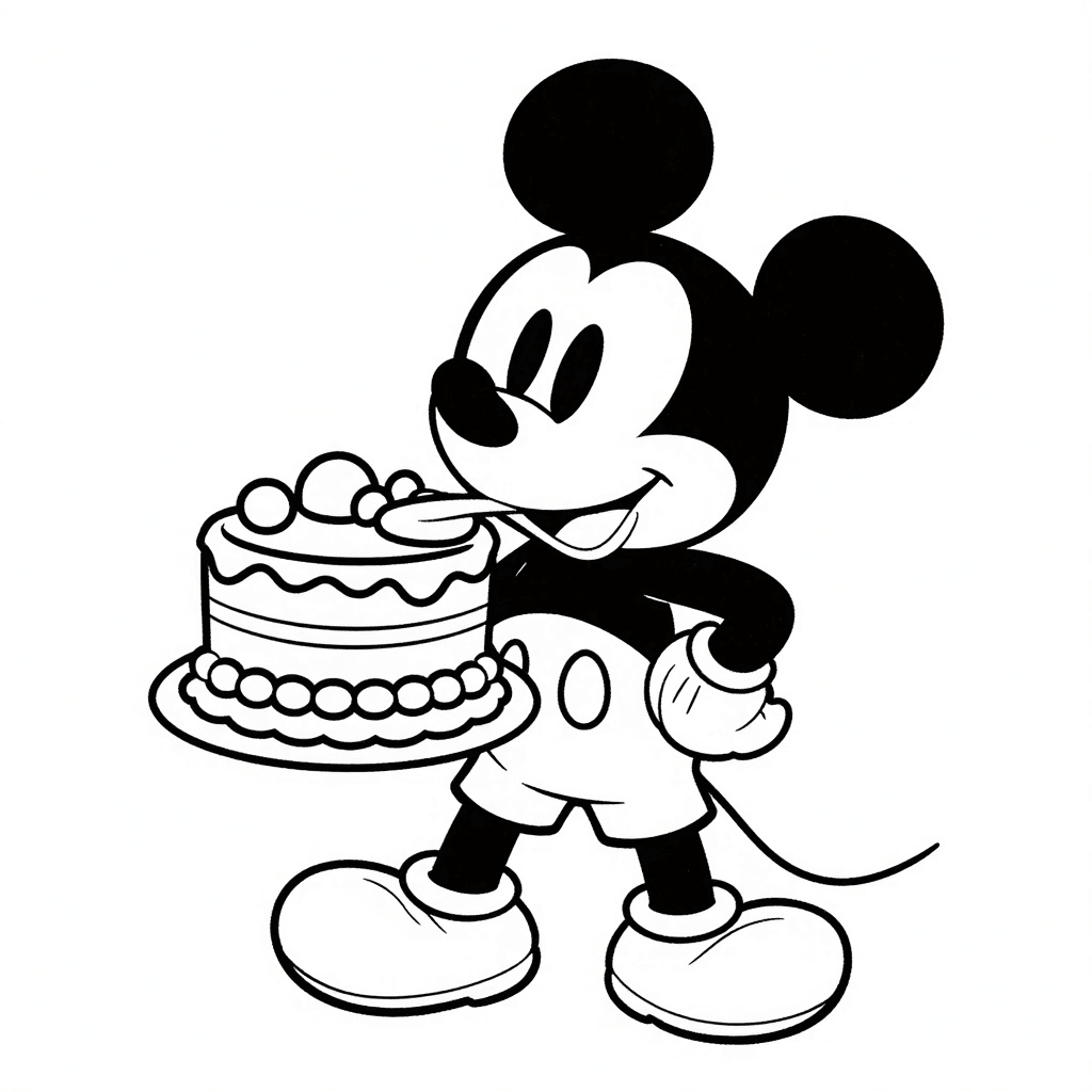 Mickey Mouse eating a big cake.